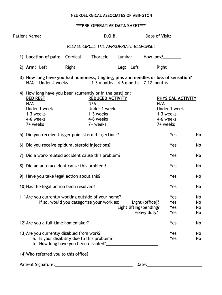 NEUROSURGICAL ASSOCIATES OF ABINGTON***PREOPERATIVE DATA SHEET*** Patient Name: D.O.B. Date of Visit: PLEASE CIRCLE THE APPROPRIATE RESPONSE: 1) Location of pain:Cervical2) Arm: LeftRightThoracicLumbar