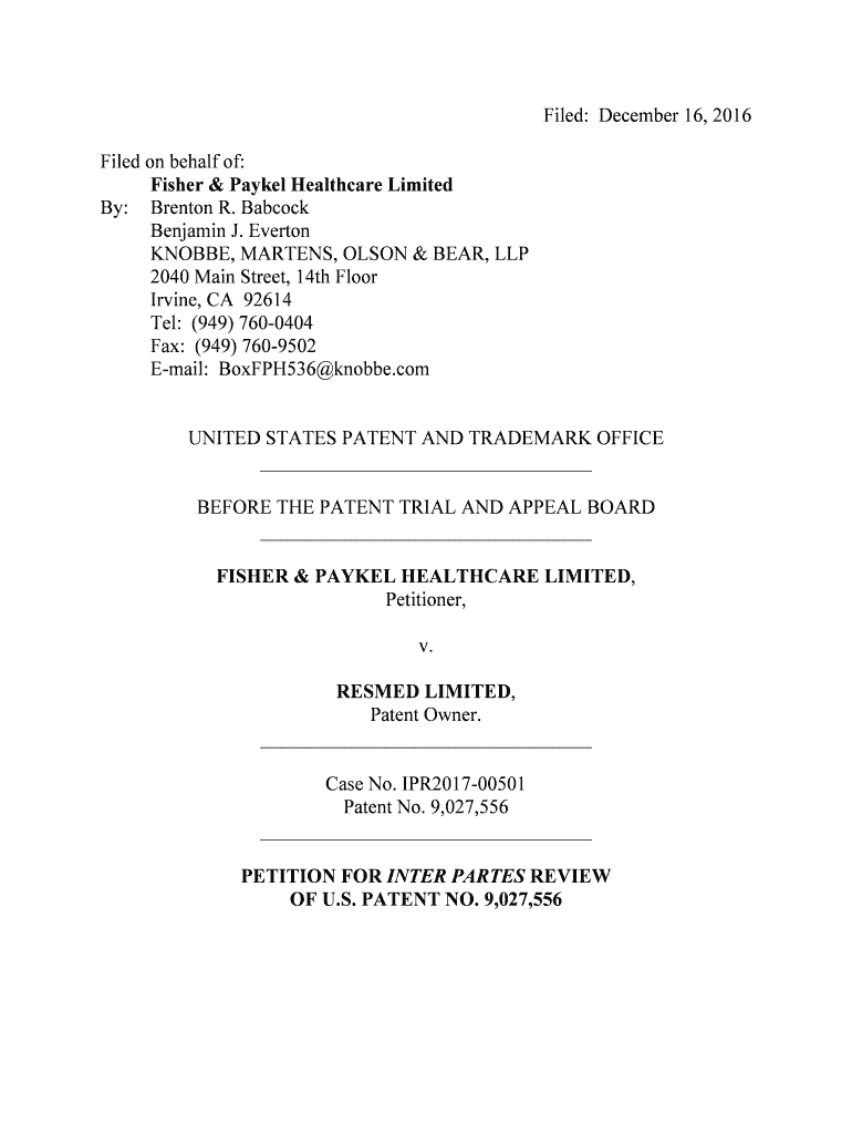 Filed: December 16, 2016, Filed on behalf of: Fisher & Panel Healthcare Limited By: Brenton R. Babcock Benjamin J. Everton KNOBBY, MARTENS, OLSON & BEAR, LLP 2040 Main Street, 14th Floor Irvine, CA