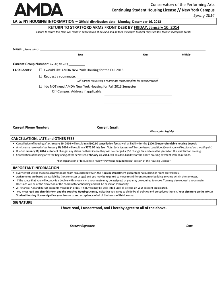 Conservatory of the Performing Arts Continuing Student Housing License // New York Campus Spring 2014 LA to NY HOUSING INFORMATION Official distribution date: Monday, December 16, 2013, RETURN TO
