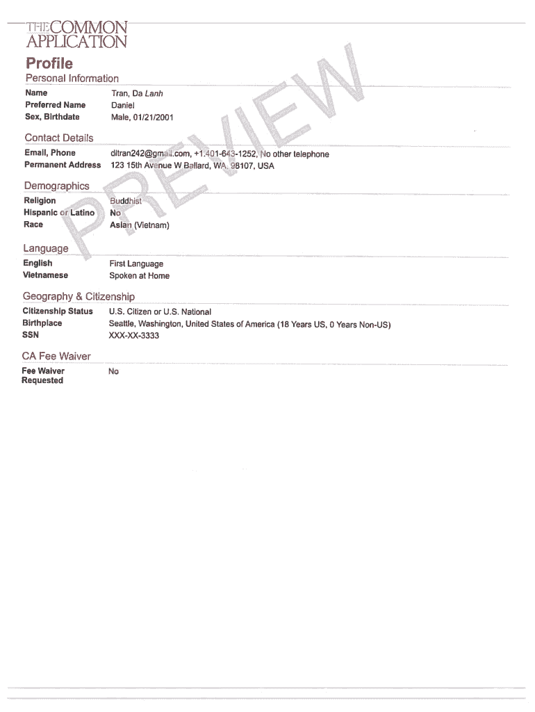 Fitch College Supplement to the Common Application Applicant Name: The (Daniel) Tran Address: 123 15th Ave. W, Ballard, WA 98107 Current High School: Ballard Unified High School Have you ever visited
