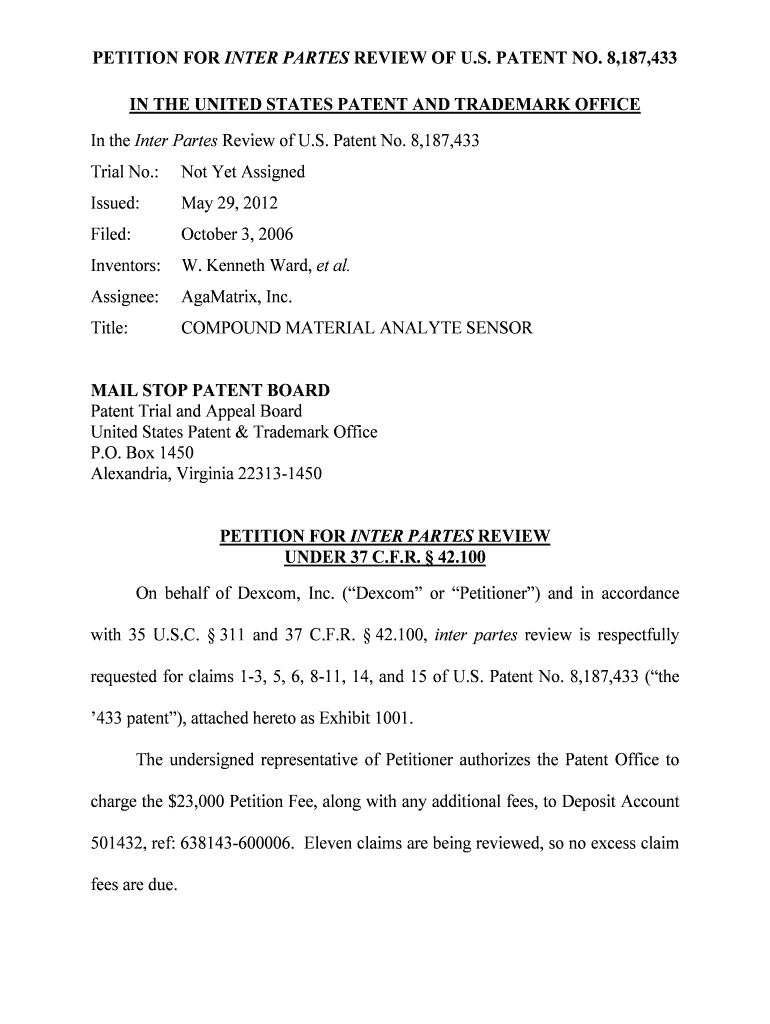 Get the free PETITION FOR INTER PARTES REVIEW OF U.S. PATENT NO. 8,187,433 ...