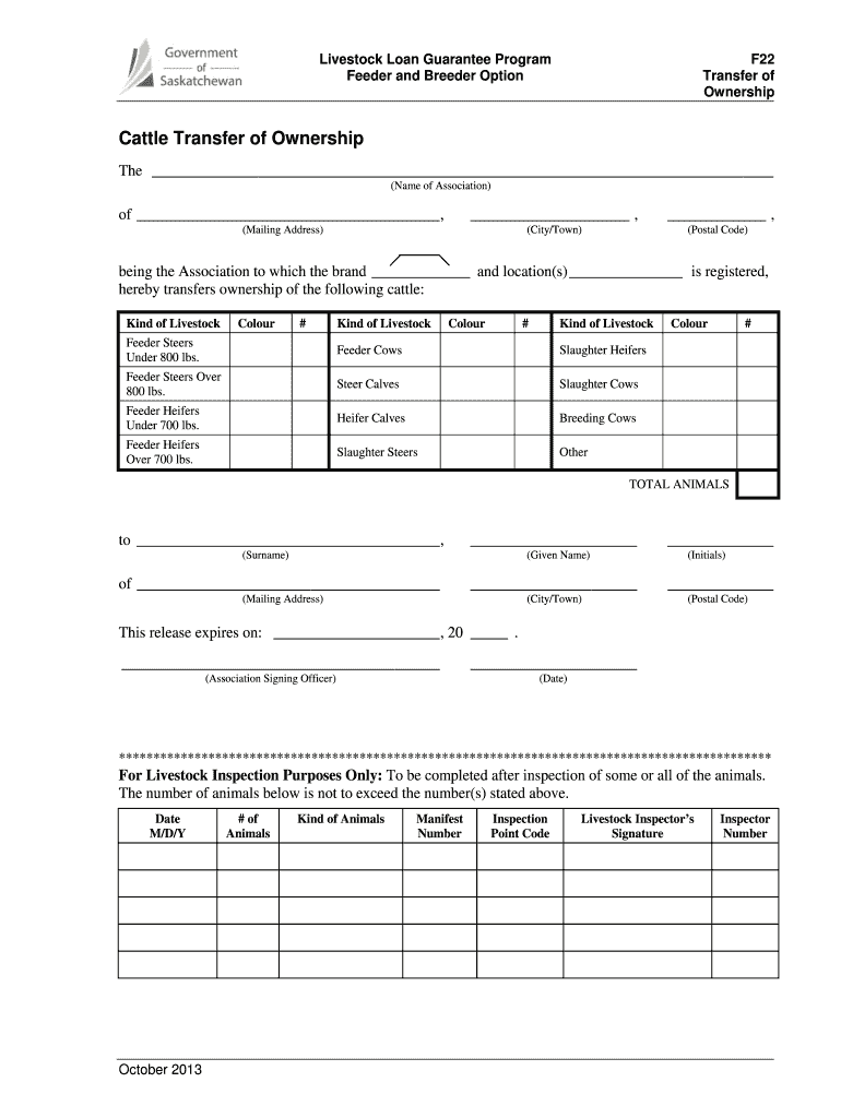 Livestock Loan Guarantee Program Feeder and Breeder OptionF22 Transfer of OwnershipCattle Transfer of Ownership The (Name of Association)of, ,, (Mailing Address)(City/Town)(Postal Code)being the Association