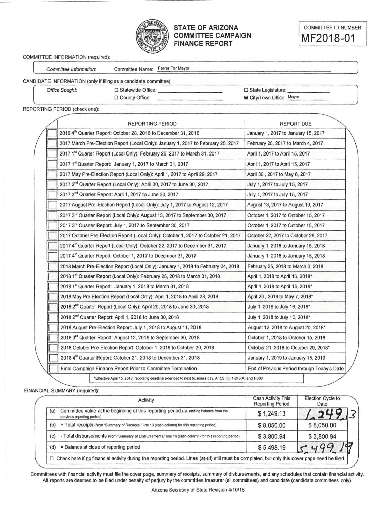 STATE OF ARIZONA COMMITTEE CAMPAIGN FINANCE REPORTCOMMITTEE ID NUMBERMF201801COMMITTEE INFORMATION (required): Committee Information:Committee Name:Farrah For MayorCANDIDATE INFORMATION (only if filing
