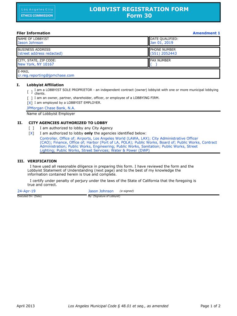 LOBBYIST REGISTRATION FORM 30 Filer InformationAmendment 1NAME OF LOBBYISTDATE QUALIFIED:Jason Johnson Jan 01, 2019BUSINESS ADDRESSPHONE NUMBER(street address redacted)(551) 2052443CITY, STATE, ZIP