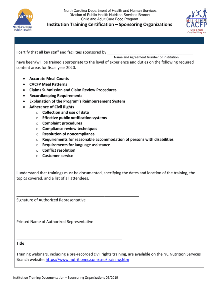 North Carolina Department of Health and Human Services Division of Public Health Nutrition Services Branch Child and Adult Care Food ProgramInstitution Training Certification Sponsoring Organizations