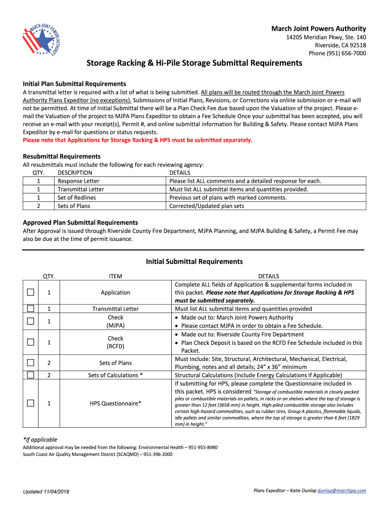 March Joint Powers Authority 14205 Meridian Pkwy, Ste. 140 Riverside, CA 92518 Phone (951) 6567000Storage Racking & Pile Storage Submittal Requirements Initial Plan Submittal Requirements A transmittal