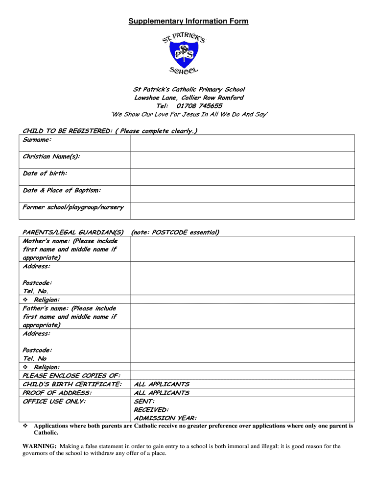 Supplementary Information FormStPatricksCatholicPrimarySchool LowshoeLane, CollierRowRomford Tel:01708745655 WeShowOurLoveForJesusInAllWeDoAndSay CHILDTOBEREGISTERED:(Pleasecompleteclearly.) Surname: