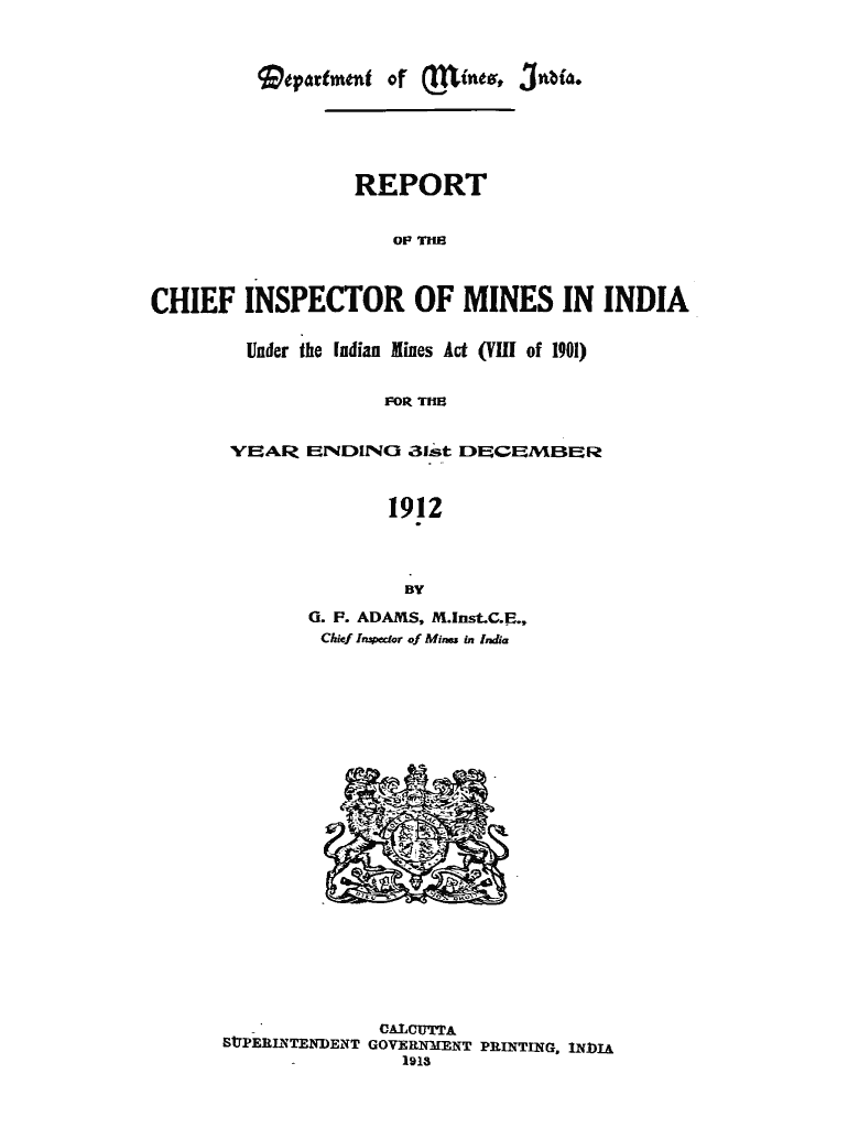 REPORT OPTHBCHIEF INSPECTOR OF MINES IN INDIA Under the Indian. Mines Act (VIII of 1901) FOR THAYER ENDING 31st DECEMBER1912 BY 0. P. ADAMS, M.last.c.a Chief inspector of Mines in India CALL 'ITAStrPERL.PENDENT