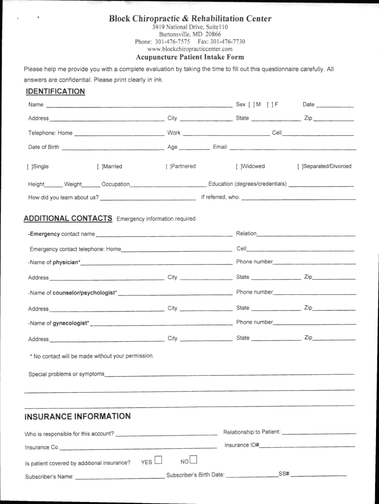 Block Chiropractic & Rehabilitation Center 3919 National Drive, Suite110 Brownsville, MD 20866 Phone: 3014767575 Fax: 3014767730 www.blockchiropracticcenter.comAcupuncture Patient Intake Form Please
