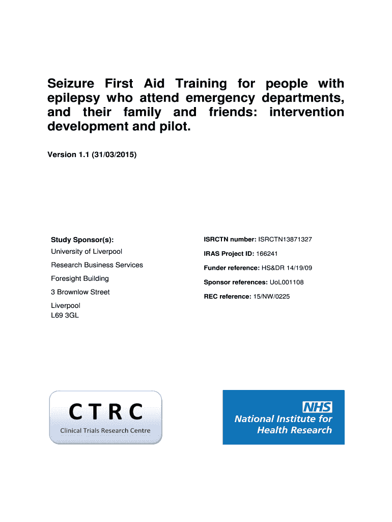 Seizure First Aid Training for people with epilepsy who attend emergency departments, and their family and friends: intervention development and pilot. Version 1.1 (31/03/2015)Study Sponsor(s):IRCGN