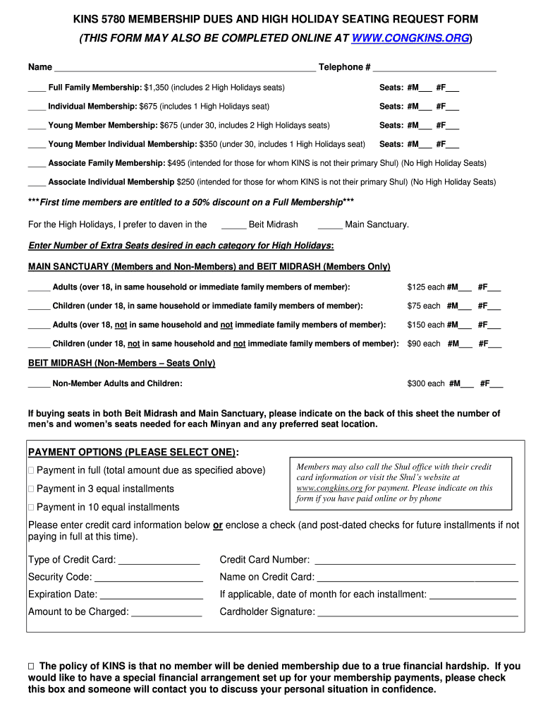 Get the free kins 5780 membership dues and high holiday seating request ...
