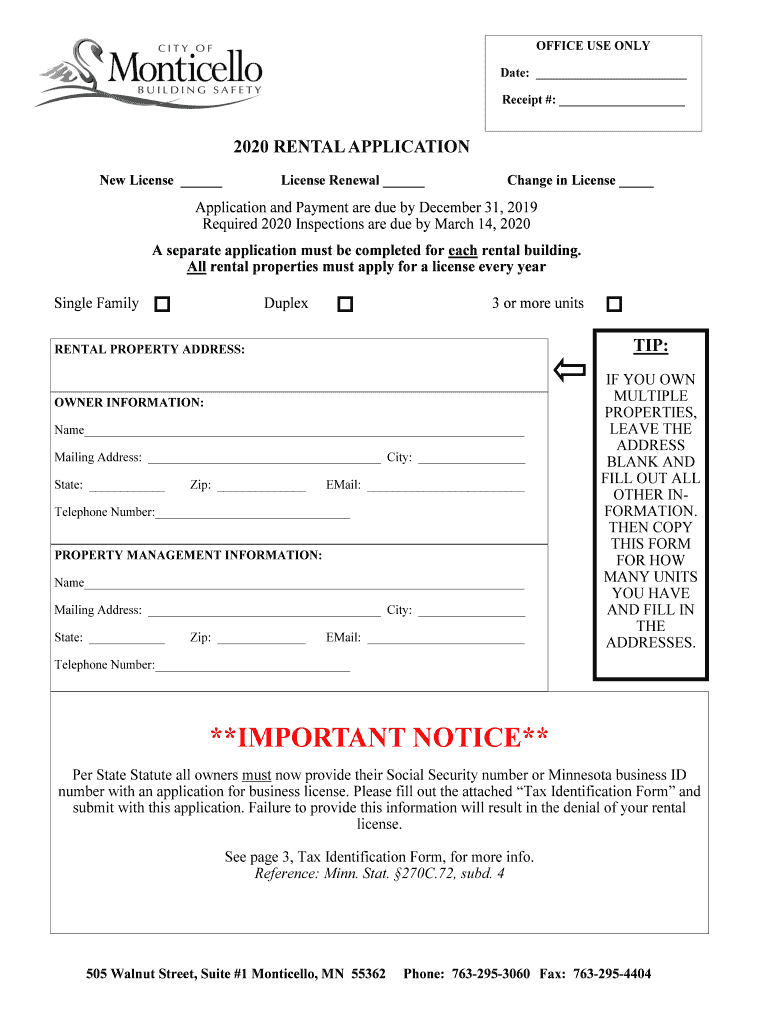 OFFICE USE ONLY Date: Receipt #: 2020 RENTAL APPLICATION New License Renewal Change in License Application and Payment are due by December 31, 2019, Required 2020 Inspections are due by March 14,