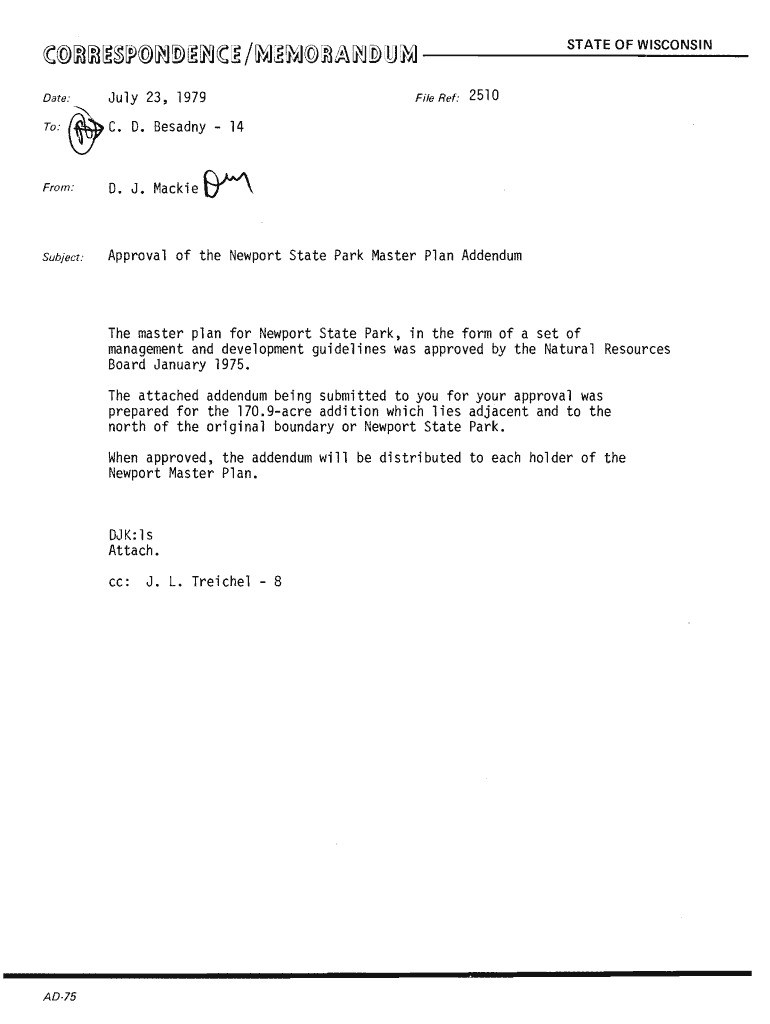 F3 f$3 P / M 3W 1.1 :MJ Date: 'July 23, 1979, C. ST A TE O F W IS CO N SI N File Ref:2510D. Beady 14From:D. J. MackieSubject:Approval of the Newport State Park Master Pl an Addendum master plan for