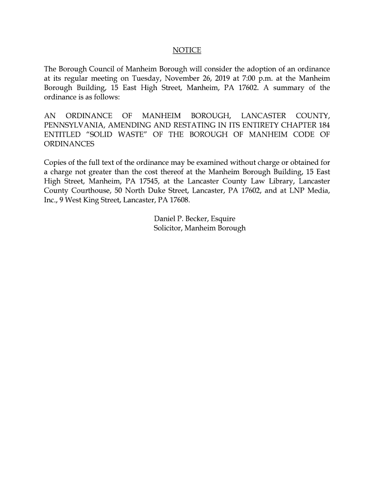 Get the free NOTICE AN ORDINANCE OF MANHEIM BOROUGH, LANCASTER COUNTY ...