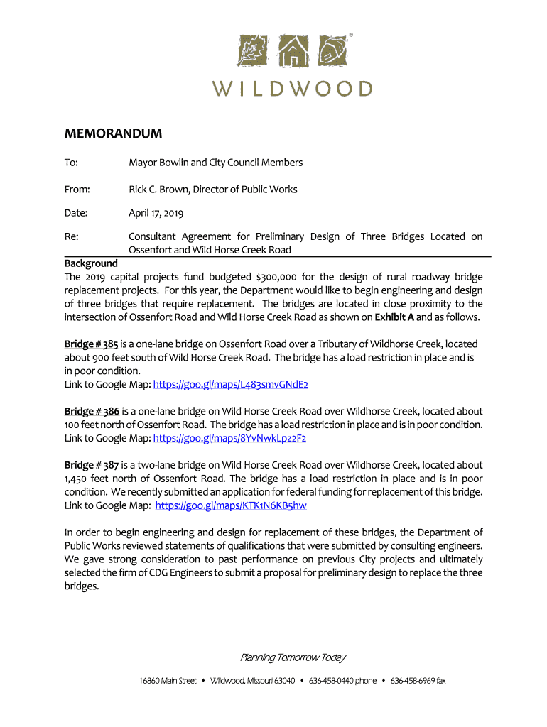 To:Mayor Bowling and City Council MembersFrom:Rick C. Brown, Director of Public Workspace:April 17, 2019Re:Consultant Agreement for Preliminary Design of Three Bridges Located on