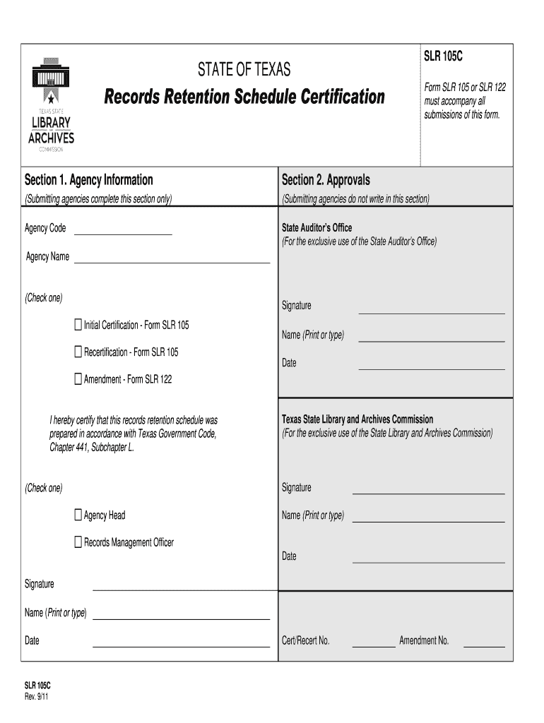 Texas State Library and Archives CommissionRetention Schedule Recertification Checklist Action Items: Retention schedules use form SLR 105 in Excel format. Do not alter the template see Instructions
