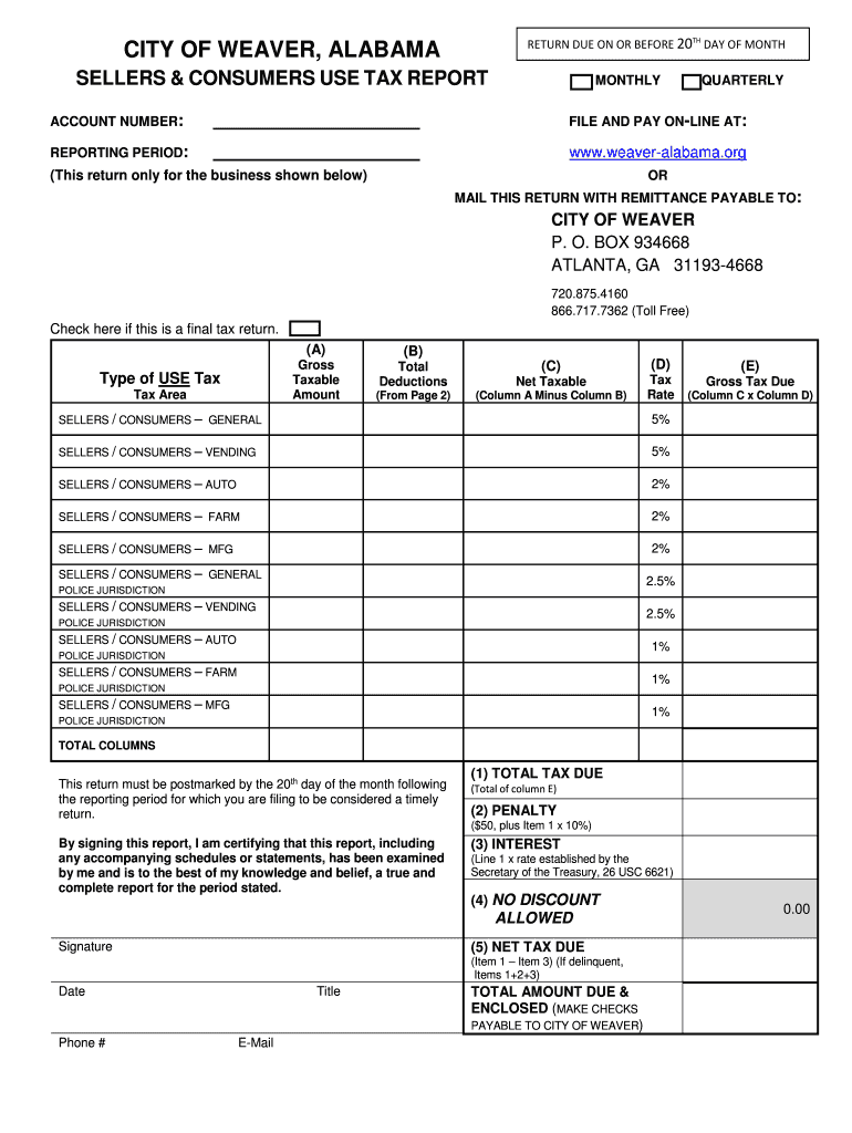 RETURN DUE ON OR BEFORE 20TH DAY OF MONTHLY OF WEAVER, ALABAMA SELLERS & CONSUMERS USE TAX REPORTMONTHLYQUARTERLYACCOUNT NUMBER:FILE AND PAY ONLINE AT:REPORTING PERIOD:www.weaveralabama.org(This return