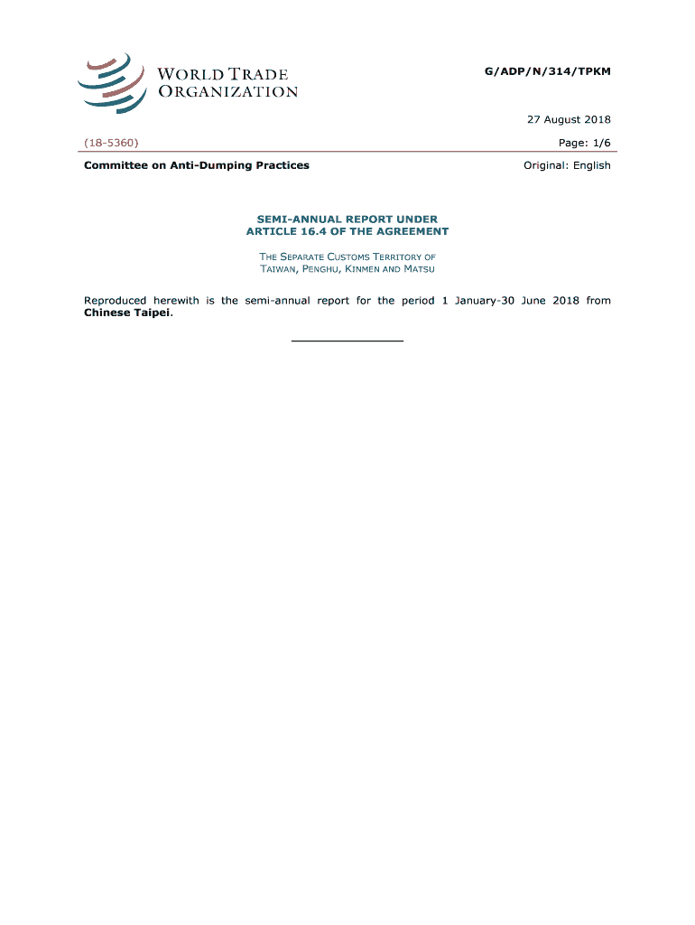 G/ADP/N/314/TPKM27 August 2018 (185360)Page: 1/6Committee on Antiquing PracticesOriginal: EnglishSEMIANNUAL REPORT UNDER ARTICLE 16.4 OF THE AGREEMENT THE SEPARATE CUSTOMS TERRITORY OF TAIWAN, PENG,