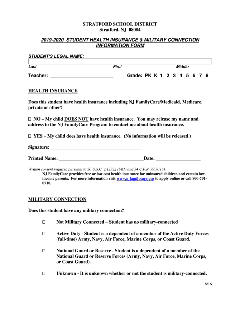 STRATFORD SCHOOL DISTRICT Stratford, NJ 08084 20192020 STUDENT HEALTH INSURANCE & MILITARY CONNECTION INFORMATION FORM STUDENTS LEGAL NAME: LastFirstTeacher: Biodegrade: PK K 1 2 3 4 5 6 7 8HEALTH