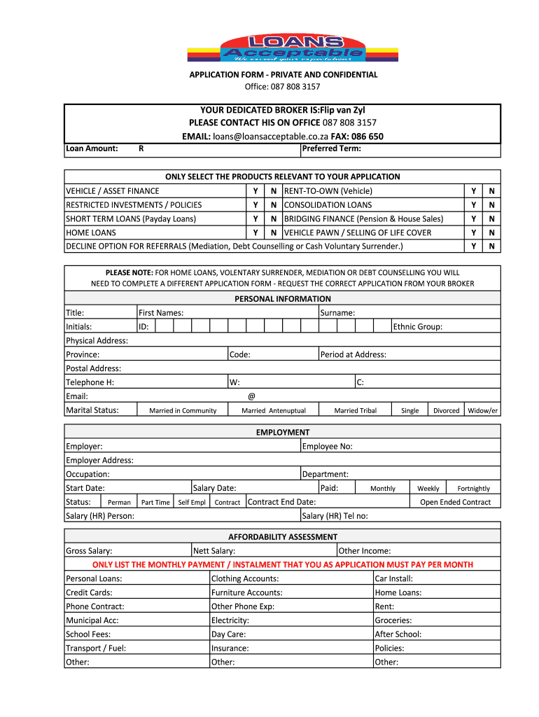 APPLICATION FORM PRIVATE AND CONFIDENTIAL Office: 087 808 3157Loan Amount:YOUR DEDICATED BROKER IS:Flip van AYL PLEASE CONTACT HIS ON OFFICE 087 808 3157 EMAIL: loans acceptable.co.ZA FAX: 086 650