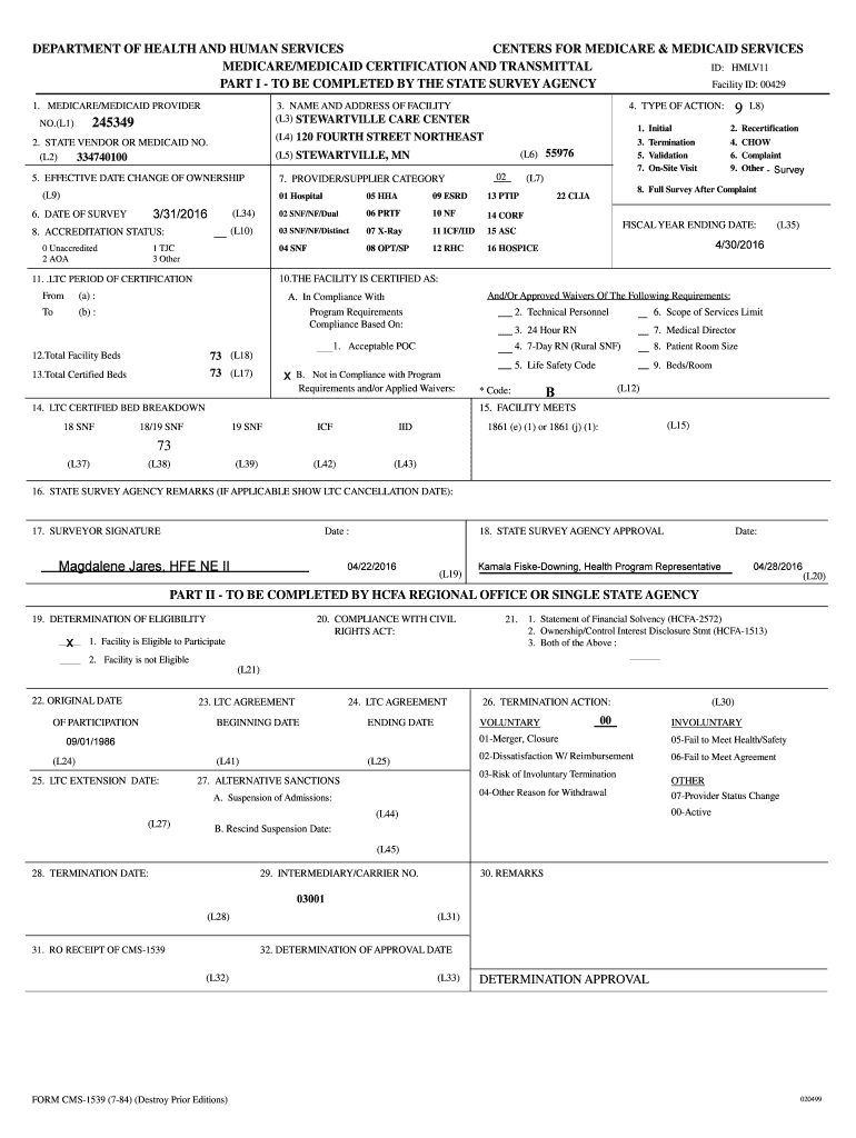 DEPARTMENT OF HEALTH AND HUMAN SERVICES CENTERS FOR MEDICARE & MEDICAID SERVICES MEDICARE/MEDICAID CERTIFICATION AND TRANSMITTAL ID: HMLV11 PART I TO BE COMPLETED BY THE STATE SURVEY AGENCY Facility