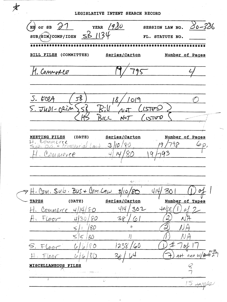 LEGISLATIVE INTENT SEARCH Recorder SB '()j! 'Lou S 1(3CfSESSION LAW NO.YEARS / COMP / IDE NFL. STATUTE NO.***************************************************************** BILL FILES (COMMITTEE)Series/CartonNumber