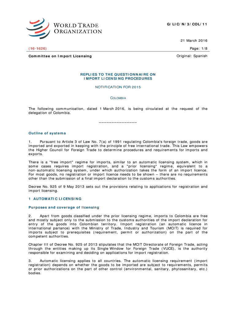 G/LIC/N/3/COL/1121 March 2016 (161626)Page: 1/8 Original: SpanishCommittee on Import LicensingREPLIES TO THE QUESTIONNAIRE ON IMPORT LICENSING PROCEDURES NOTIFICATION FOR 2015 COLOMBIA The following