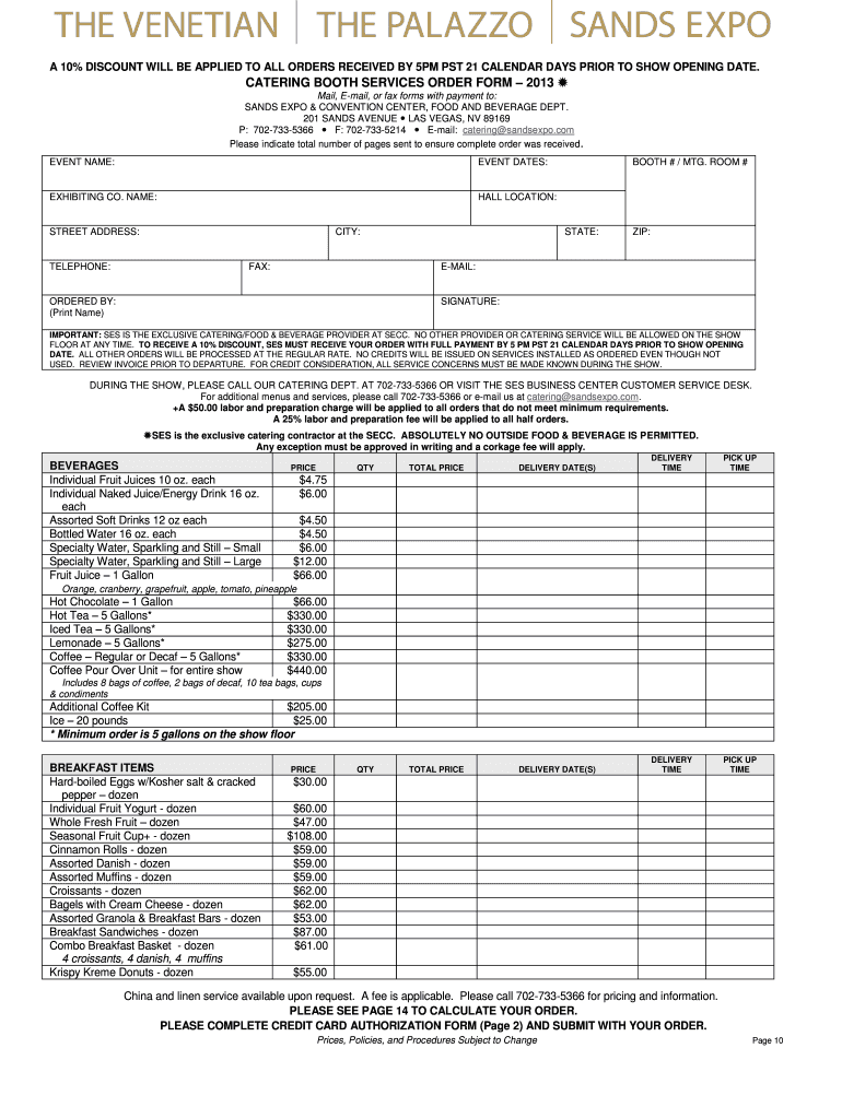 The Catering Booth Services Order Form is a crucial document for ordering catering services for events held at the Sands Expo & Convention Center. This form streamlines the process by providing a standardized method for users to request food and beverage services tailored to their event needs. When utilizing this catering order form, users can expect a straightforward experience that ensures their catering requests are efficiently addressed.
