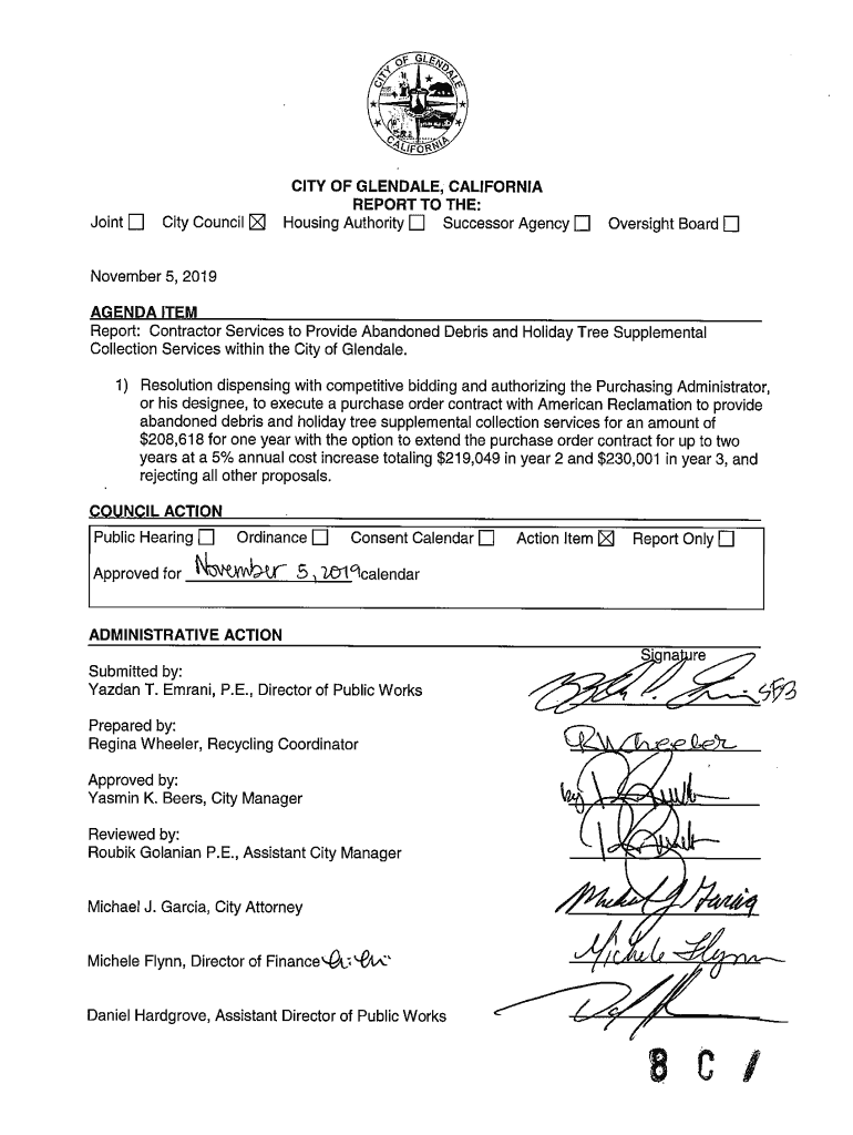 JointflCity Council CITY OF GLENDALE, CALIFORNIA REPORT TO THE: Housing Authority Successor Agency Oversight BoardElNovember 5, 2019 AGENDA ITEM Report: Contractor Services to Provide Abandoned Debris