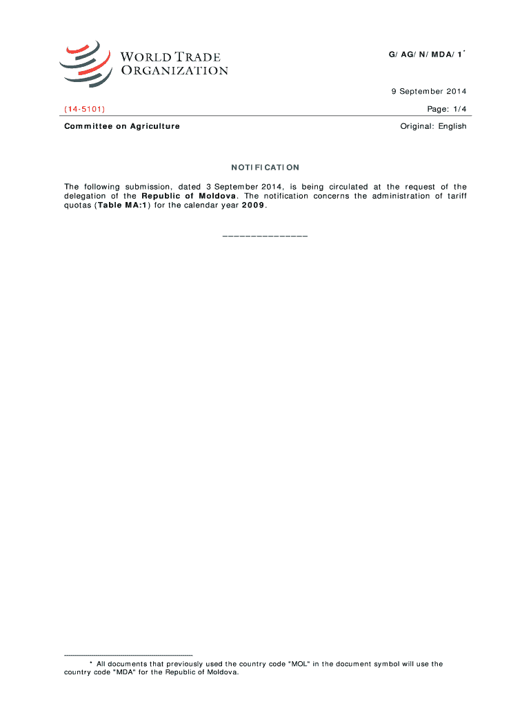 G/AG/N/MDA/1×9 September 2014 (145101)Page: 1/4Committee on AgricultureOriginal: EnglishNOTIFICATION The following submission, dated 3 September 2014, is being circulated at the request of the delegation