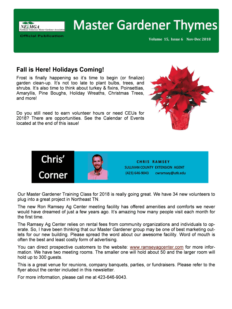 Volume 15, Issue 6 Nov Dec 2018Fall is Here! Holidays Coming! Frost is finally happening, so it's time to begin (or finalize) garden cleanup. It's not too late to plant bulbs, trees, and shrubs. It's