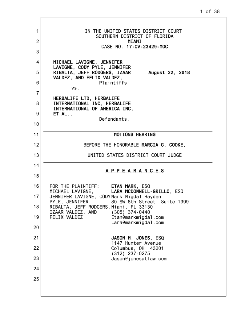 1 of 381IN THE UNITED STATES DISTRICT COURT SOUTHERN DISTRICT OF FLORIDA 2 MIAMI CASE NO. 17CV23429MGC 3 4 5 6 7 8 9 10 11 12 13 14 15 16 17 18 19 20 21 22 23 24 25MICHAEL RAVINE, JENNIFER RAVINE,