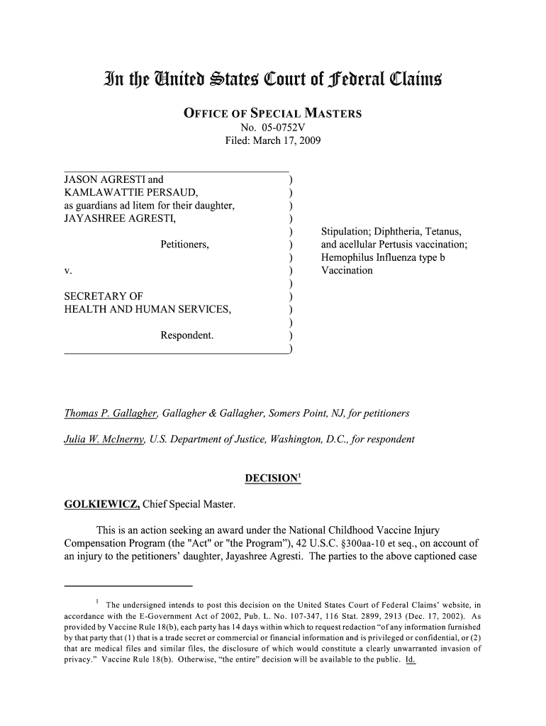 In the United States Court of Federal Claims OFFICE OF SPECIAL MASTERS No. 050752V Filed: March 17, 2009, JASON ARREST and) KAMLAWATTIE PERSEUS, ) as guardians ad item for their daughter, ) JAYASHREE