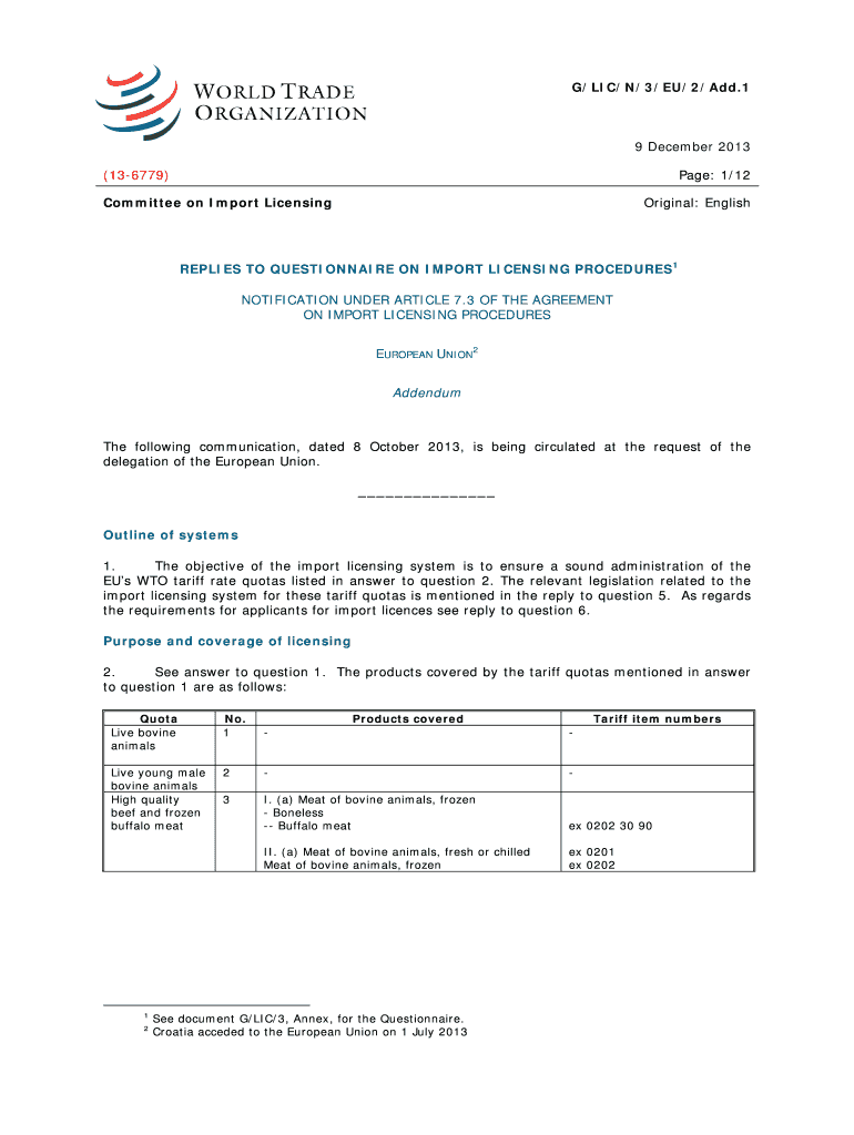 G/LIC/N/3/EU/2/Add.19 December 2013 (136779)Page: 1/12Committee on Import LicensingOriginal: EnglishREPLIES TO QUESTIONNAIRE ON IMPORT LICENSING PROCEDURES1 NOTIFICATION UNDER ARTICLE 7.3 OF THE AGREEMENT