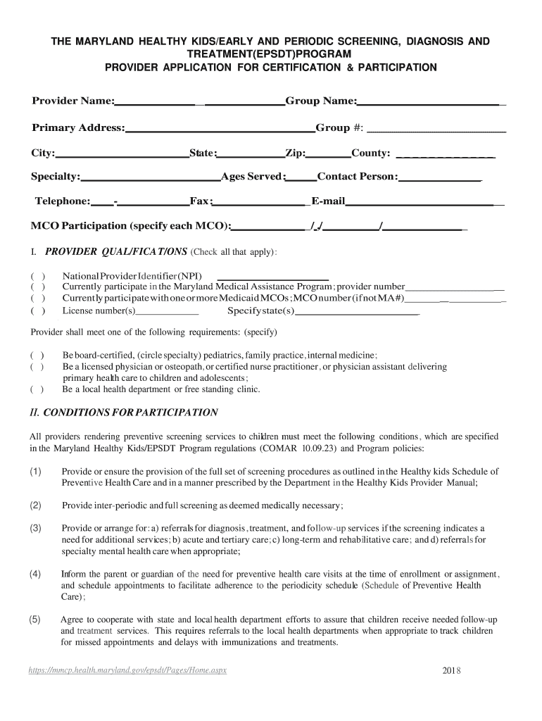 THE MARYLAND HEALTHY KIDS/EARLY AND PERIODIC SCREENING, DIAGNOSIS AND TREATMENT(EPS DT)PROGRAM PROVIDER APPLICATION FOR CERTIFICATION & PARTICIPATION Provider Name: Group Name:Group #: Primary Address: