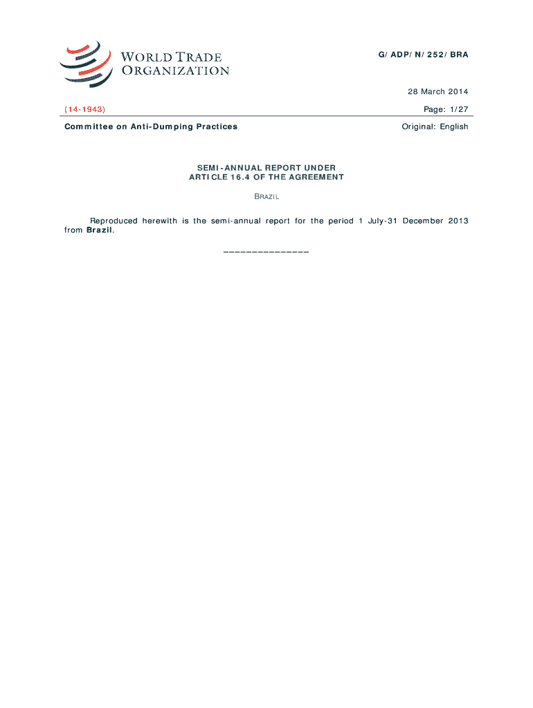 G/ADP/N/252/BRA28 March 2014 (141943)Page: 1/27Committee on Antiquing PracticesOriginal: EnglishSEMIANNUAL REPORT UNDER ARTICLE 16.4 OF THE AGREEMENT BRAZIL Reproduced herewith is the semiannual report