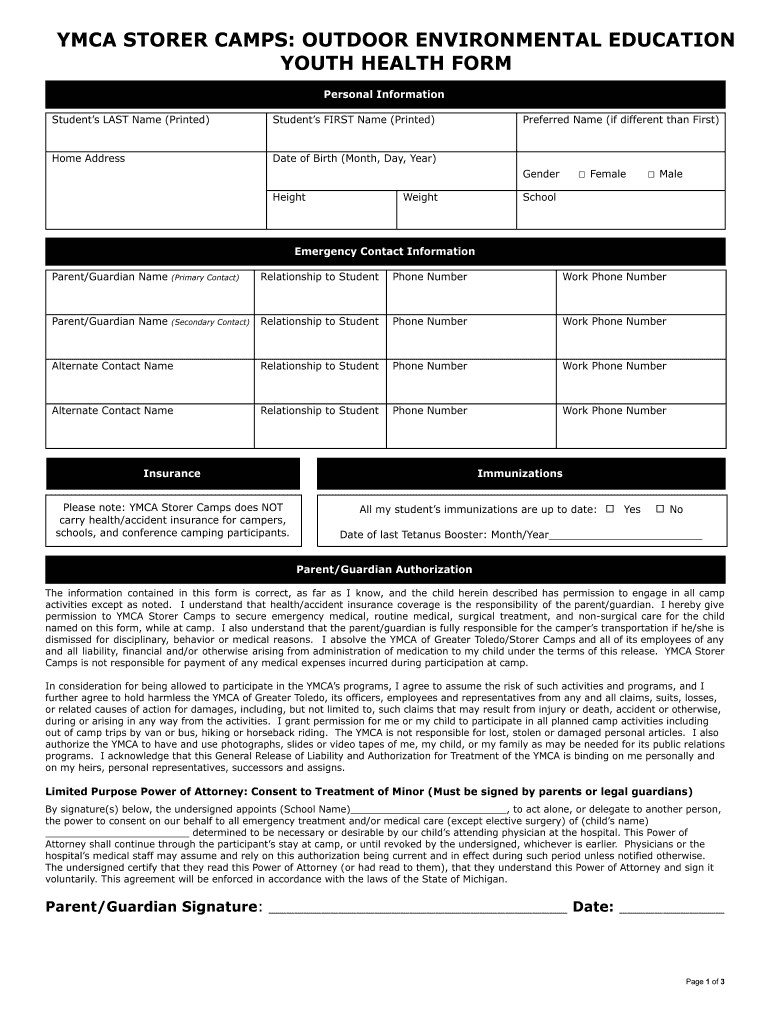 YMCA Storer Camps Youth Health form is required for any individual who wishes to participate in the YMCA Storer Camps program.