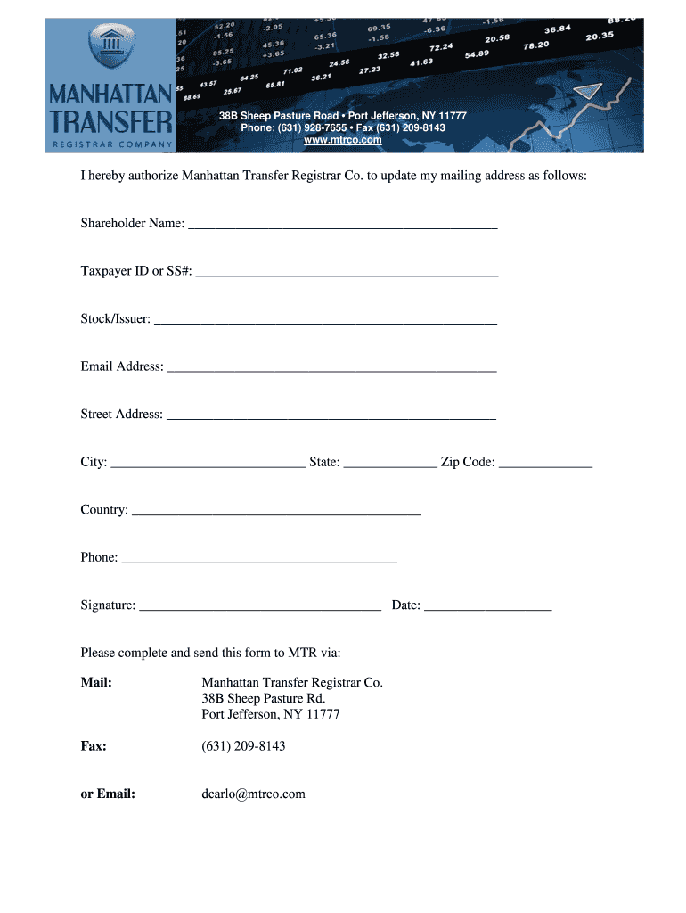 38B Sheep Pasture Road Port Jefferson, NY 11777 Phone: (631) 9287655 Fax (631) 2098143 www.mtrco.comI hereby authorize Manhattan Transfer Registrar Co. to update my mailing address as follows:Shareholder
