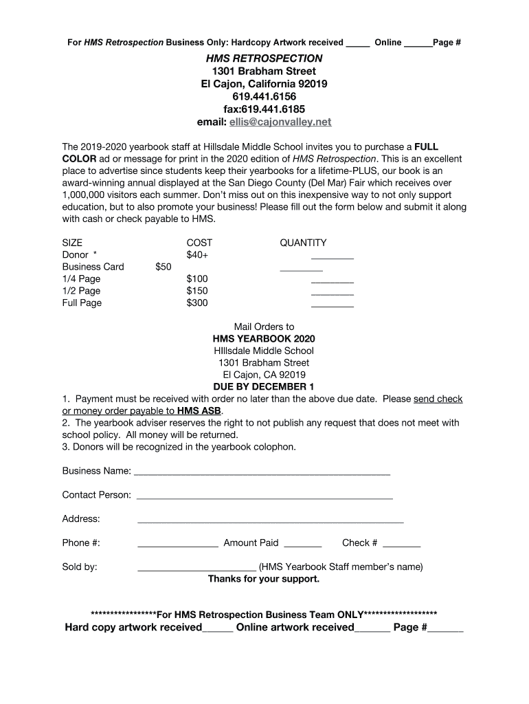 For HMS Retrospection Business Only: Hard copy Artwork received Online Page #HMS RETROSPECTION 1301 Graham Street El Cajon, California 92019 619.441.6156 fax:619.441.6185 email: Ellis cajonvalley.net