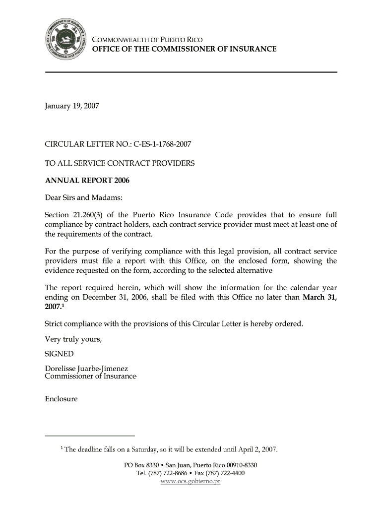 OFFICE OF THE COMMISSIONER OF INSURANCE January 19, 2007CIRCULAR LETTER NO.: CES117682007