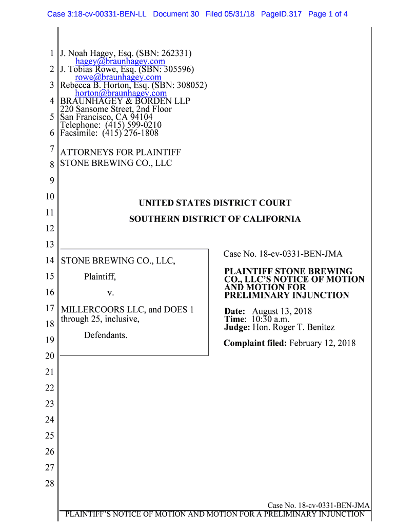 Case 3:18cv00331BENLL Document 30 Filed 05/31/18 Paged.317-Page 1 of 41 J. Noah Heyday, Esq. (SON: 262331) heyday braunhagey.com 2 J. Tobias Rowe, Esq. (SON: 305596) Rowe braunhagey.com 3 Rebecca