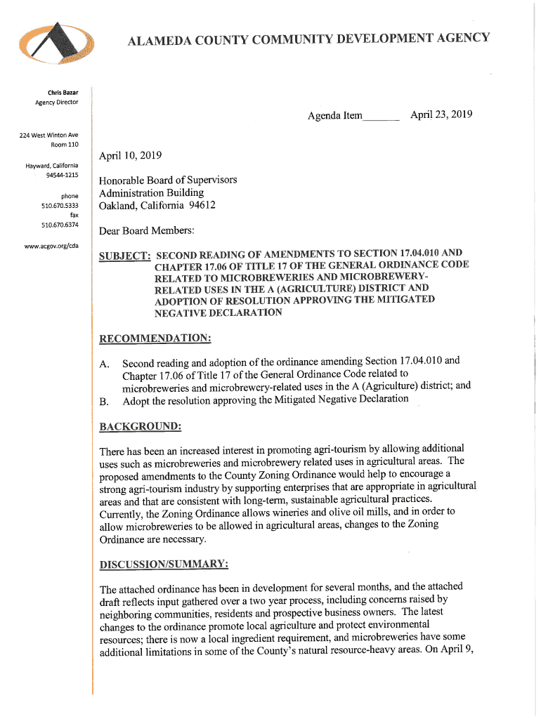ORDINANCE 2019 AN ORDINANCE AMENDING SECTION 17.04.010 AND CHAPTER 17.06 OF TITLE 17 OF THE GENERAL ORDINANCE CODE OF THE COUNTY OF ALAMEDA REGARDING MICROBREWERIES AND MICROBREWERY RELATED USES SECTION