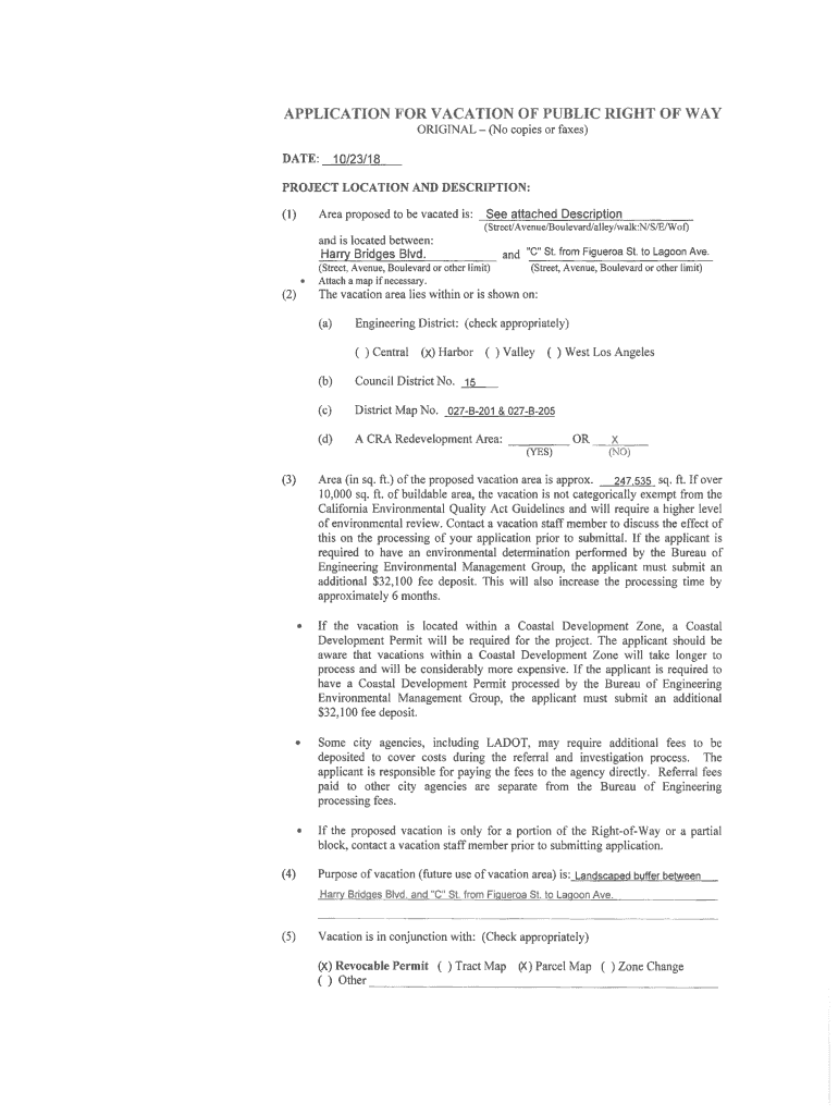 APPLICATION FOR VACATION OF PUBLIC RIGHT OF WAY ORIGINAL (No copies or faxes)DATE:10/23/18PROJECT LOCATION AND DESCRIPTION: Area proposed to be vacated is:0)See attached Description (Street/Avenue/Boulevard/alley/walk:N/S/E/Of)and