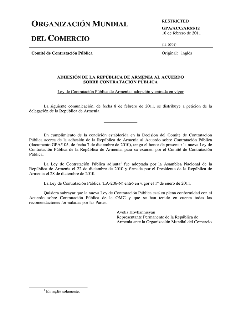 ORGANIZATION SUNDIAL DEL COMERCIORESTRICTED GPA/ACC/ARM/12 10 de Ferraro de 2011 (110701)Original: inglsComit de Contratacin PblicaADHESIN DE LA REPLICA DE ARMENIA AL ACTED SORE CONTRATACIN PBL ICA