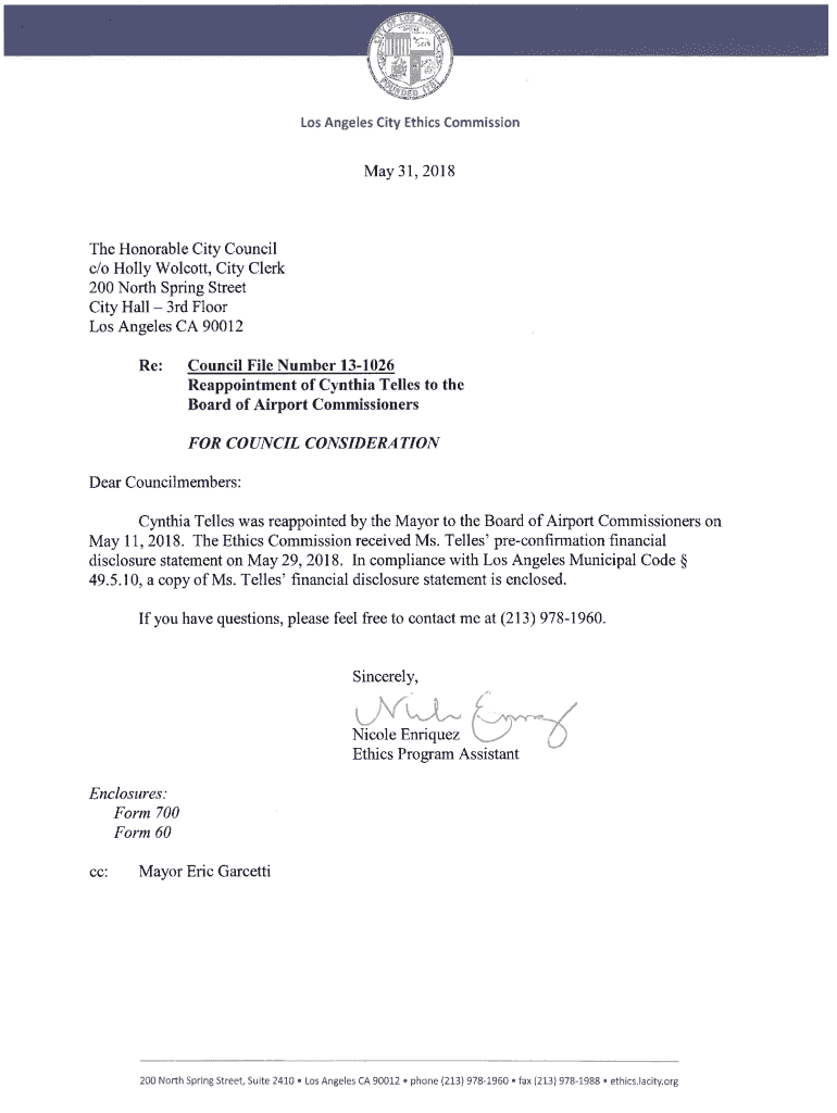 W 'It tyPICsitots* Los Angeles City Ethics Commission May 31, 2018The Honorable City Council c/o Holly Wolcott, City Clerk 200 North Spring Street City Hall 3rd Floor Los Angeles CA 90012 Re:Council