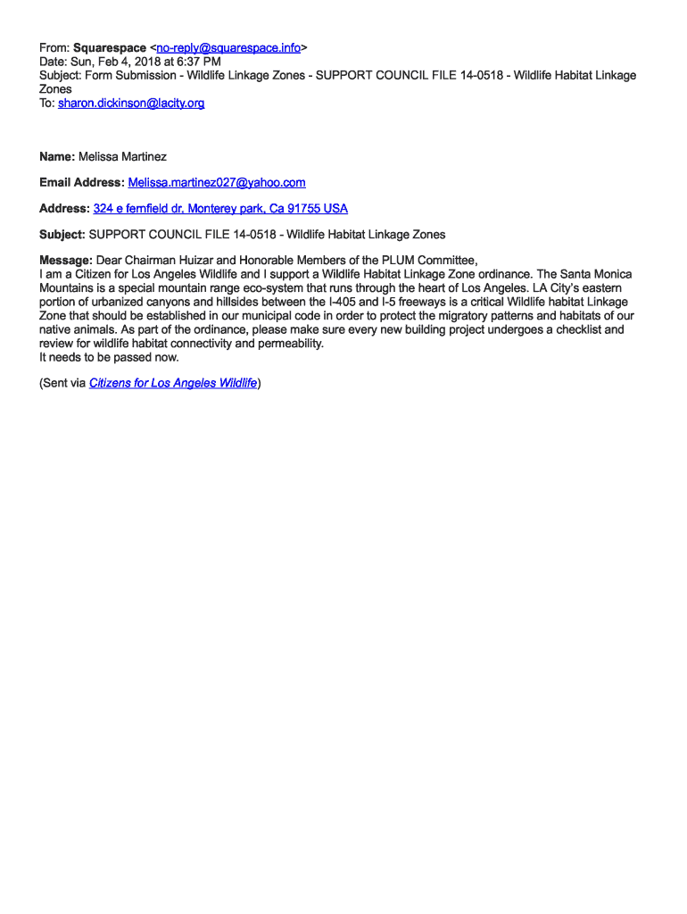 From: Squarespace no reply Squarespace.info Date: Sun, Feb 4, 2018 at 6:37 PM Subject: Form Submission Wildlife Linkage Zones SUPPORT COUNCIL FILE 140518 Wildlife Habitat Linkage Zones To: Sharon.