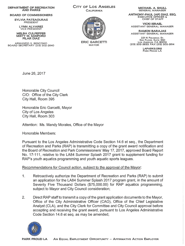 DEPARTMENT OF RECREATION AND PARKSCityofLos AngelesCaliforniaMICHAEL A. SHALL GENERAL MANAGERANTHONYPAUL (AP) DIAZ. ESQ.BOARD OF COMMISSIONERSEXECUTIVE OFFICER & CHIEF OF STAFFASYLVIA PATSAOURAS PRESIDENTVICKI