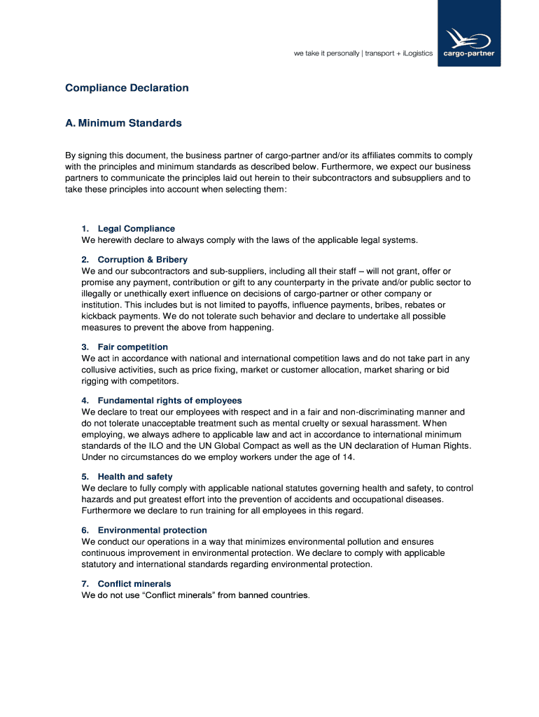 By signing this document, the business partner of cargo partner and/or its affiliates commits to comply