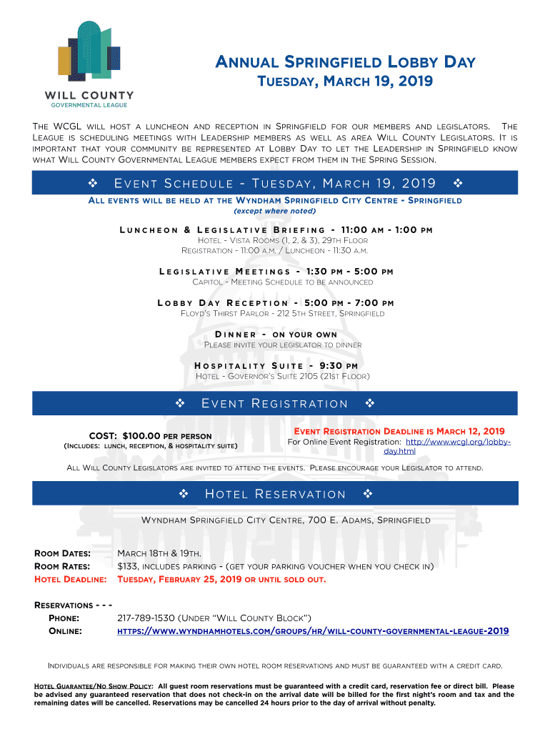 ANNUAL SPRINGFIELD LOBBY DAY TUESDAY, MARCH 19, 2019, THE CGL WILL HOST A LUNCHEON AND RECEPTION IN SPRINGFIELD FOR OUR MEMBERS AND LEGISLATORS. THE LEAGUE IS SCHEDULING MEETINGS WITH LEADERSHIP MEMBERS