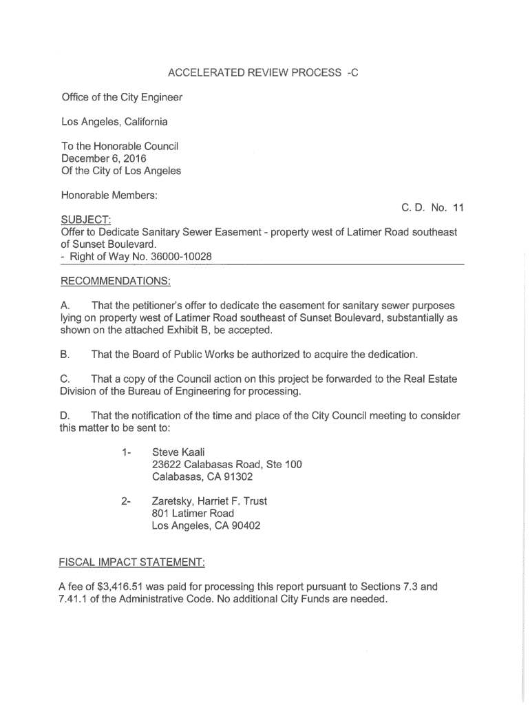 ACCELERATED REVIEW PROCESS C Office of the City Engineer Los Angeles, California To the Honorable Council December 6, 2016, Of the City of Los Angeles Honorable Members: C. D. No. 11 SUBJECT: Offer
